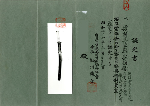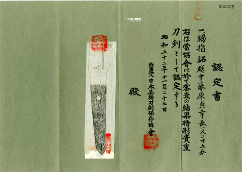 特別保存刀剣鑑定書特別貴重刀剣認定書