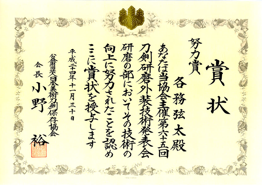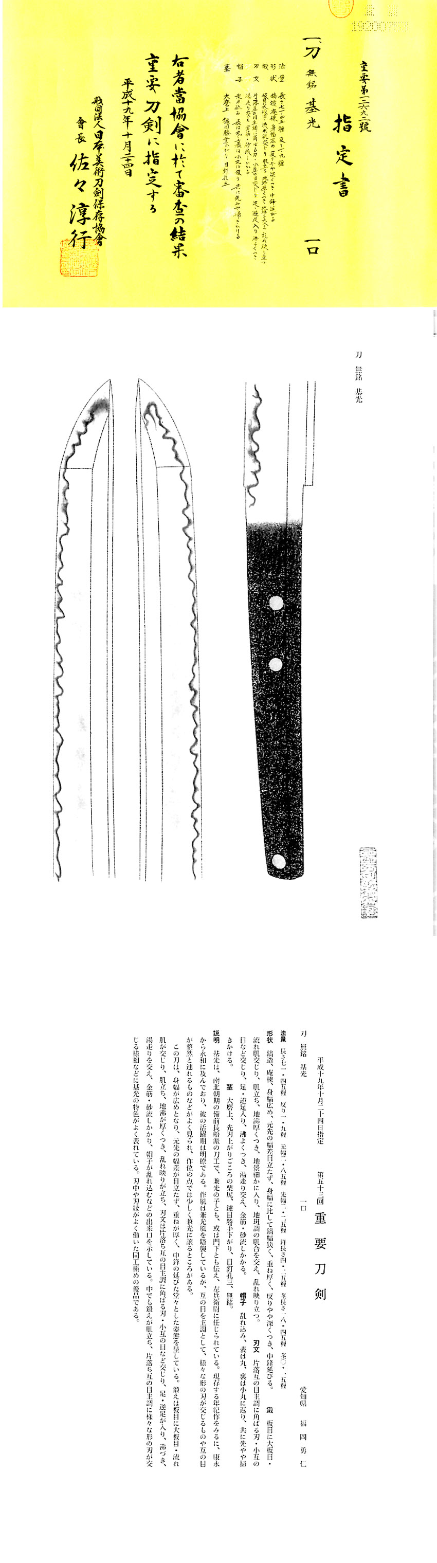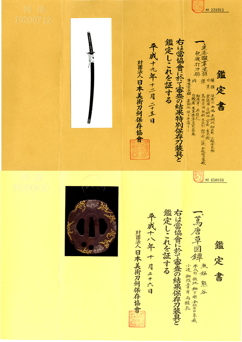 | 剣形:鎬造り、庵棟、元先ともに身幅広く、腰反りがつく。重ねが厚く、平地が広い造りこみで中峰延びる(刀身全体写真)。 鍛肌:杢目肌に板目肌、刃寄りに流れ肌交え、相対に肌立ち、地沸付き、地景かかり、乱れ映りたつ。 刃紋:表は肩落互の目を基調に小互の目、腰開いた互の目交え、逆足が入り、此処に砂流しかかり、下半は焼刃高く逆がかった大房丁子となり僅かに飛び焼きがあり金線が入る。裏は小互の目に小丁子、尖り刃、角ばった肩落ちの互の目交え、総体に逆ごころあり、逆足良くはいり、砂流し入る。 中心:磨上げ無銘。鑢目は勝手下がり、茎尻は栗尻。目釘孔三個。 帽子:表は大きく乱れこんで匂いで尖りごころに返る。 南北朝時代の長船系は鎌倉時代末期の勇壮な姿が極度に誇張され太刀は身幅広く、寸も極度に伸びて三尺を超えるものもあり、背負太刀や野太刀と云われる大振りなものが出現した時代でもある。初代兼光門には二代の兼光や同門の倫光や政光および表題の基光らの名工を排出しており本伝である備前伝を基本としながらもこれに相州伝を取入れ当世の武人の好みや流行に適した沸出来の相州伝を加味して時流の要請に応えた。 表題の刀は大磨上げながら幅広く、重ねは厚く踏ん張りがあり、腰反りの感強く切先が大きく延びる。鍛えは杢目鍛えに板目肌を交えて、乱れ映りが立ち、刃文は伝統の肩落ち互の目を基調として互の目の頭から匂が尖って地に煙りこみ、表下半は脊の高い逆がかった丁子刃を列ねて金筋、砂流しかかるなど個性的で特徴がある。刃中や刃縁がよく働いた同工極めの優品である。 基光は南北朝期の備前長船派の刀工で、兼光の子とも、或は門下とも伝え、左兵衛尉に任じられている。現存する年紀作をみるに、康永〜永和(1342〜1378)におよび、活躍期は明瞭である。作風は師伝の兼光風を蹈襲しており、やや下方から腰元にかけては焼刃の高い逆がかった大房丁子を焼いて、上部は片落ち互の目が主調となる刃文は個性的であり、同工の特色がよく顕れている。 附帯の黒漆皺革塗鞘肥後打刀拵は江戸時代後期の作で皺革地仕立漆塗鞘、赤銅地の波文縁頭、素銅地焼き手腐らし手法の唐草文鐺、龍図目貫、肥後蔦唐草象嵌鍔および熊谷木瓜形鍔(保存刀装具)の二枚が附帯している。 刀身は豪壮で健全な体躯を称え、外装は白鮫着に焦茶漆革塗菱捲ともに元姿の状態を保つ内外ともに完存の優品である。 本刀は各務弦太氏による差し込み拭い研ぎが施された。同氏は平成二十四年、公益財団法人日本美術刀剣保存協会主催の第六十五回刀剣研磨外装技術発表会、研磨の部において本刀を出品されて努力賞を受賞、同協会の刀剣博物館にて展示された。 差し込み拭いの手法により具現化された自然な景色は南北朝期の長船正系に属する同工の地刃に妖艶たる美しさを再現して十二分に堪能できる。 時代金着せ二重牡丹はばき、上質白鞘入り |
