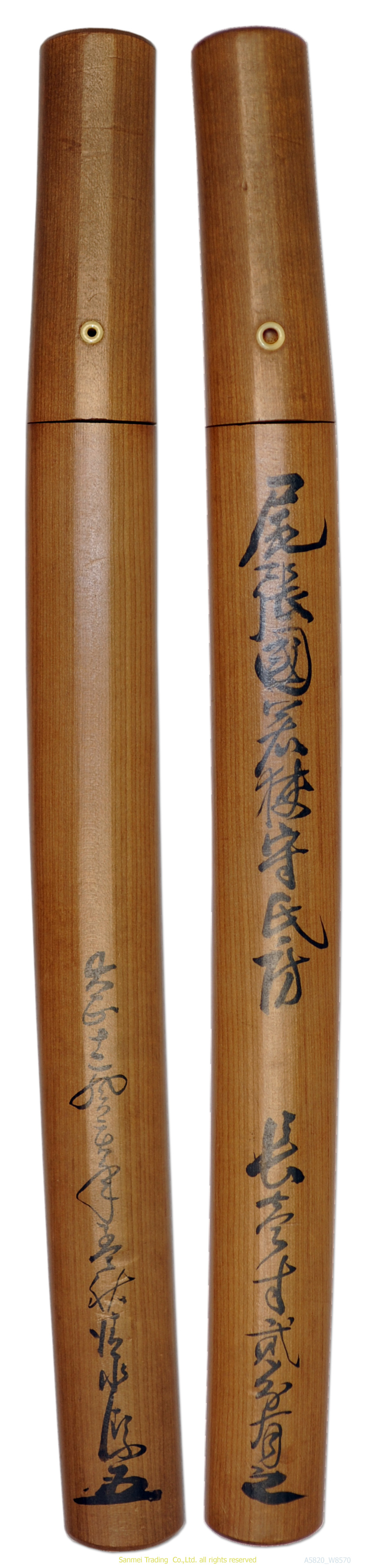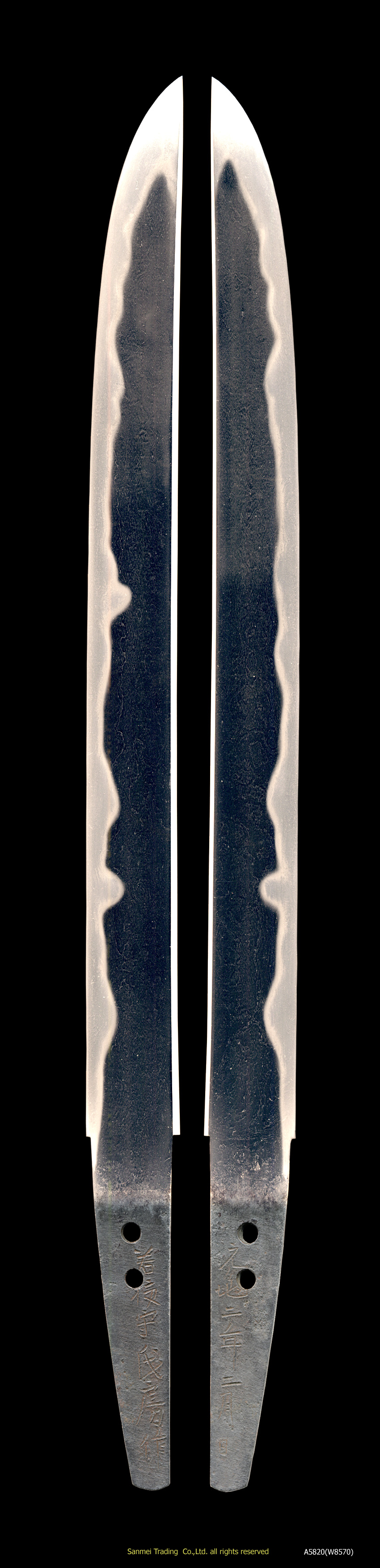 | 剣形:平造り、庵棟。寸延びて、重ねは薄く、身幅が広い。ごく浅く中間反りがついた元亀・天正頃の寸延び短刀の姿をしている。(刀身拡大写真) 鍛肌:板目が流れ肌目たち潤いがある美麗な鍛肌。細かな地錵付いて鉄色は青黒色を呈し、上半に沸映りがたつ。 刃紋:小沸の付いた湾れに互の目を交え、表裏の刃はよく揃い、美濃物独特の背の高い腰括れの丁子刃を焼いて、焼頭は平地に煙り込んで地斑調の映りがある。刃中の匂は深く充満し、刃縁には細かな砂流しを交えて匂口が明るく冴える。 帽子:乱れ込んで地蔵となり、先掃きかけて返りはやや深く棟で留る。 中心:生ぶ。総体に小降りな茎で、茎尻が細くなり刃上り栗尻。刃側が丸く、棟肉平となる。鑢目は勝手下がり。茎孔弐個。表は『若狭守』を小さく、『氏房作』を大きく切る。裏には『元亀二年二月日』の年紀がある。 若狭守氏房は天文三年(1534)、関七流中の善定家である清左衛門兼房の三男として岐阜に生まれた。姓は河村、名を京三郎と称し、初銘を「兼房」という。弘治二年(1556)、長兄の岩見守国房より善定家の惣領を譲られて嫡子となり名を清左衛門と改め、美濃国関に移住している。永禄十三年(1570)四月十九日、三十七歳の時に清左衛門少尉に任ぜられ「氏房」と改め、三日後の二十二日には若狭守を受領している。 尾張国清洲の城主、織田信長に仕えて抱鍛冶となった。天正五年(1577)、信長に従い近江国安土城下で駐鎚。同十年(1582)六月二十一日、本能寺の変で信長自害の後は岐阜に帰郷して織田信孝の扶持を受け、同十二年(1584)尾張国清洲城下で蟹江城主、佐久間正勝の扶持を受けて鍛刀に励んだ。相模守政常、伯耆守信高と並んで尾張三名工の一角を占める優工である。同十八年(1590)五月十一日没、享年五十七。名古屋大須門前町の東蓮寺(現在は昭和区八事に移転)に睡る、法名『前若州大守良屋宗善居士』。 熱田神宮には「氏房」に改銘する前の代表作で愛知県の指定文化財、太刀 銘 「河村京三郎 濃州関住兼房作」、刀身に切付銘で「永禄十一年二月吉日 奉寄進熱田太神宮 兼房作」がある。また、織田信長の安土城築城後に駐鎚した脇指 銘 「若狭守氏房 江州安土住人」がある。 本作は『若狭守』を小さく、『氏房』を大きく切る氏房壮年期の典型的な銘振りをしており、元亀二年(1571)の年紀があることから「氏房」改銘の翌年、清左衛門三十八歳の作であることが判る。天下布武を目指す織田信長と浅井・朝倉両軍との軍事的・政治的決戦、元亀元年(1570)の『姉川の合戦』、『石山本願寺の一向一揆』や元亀二年(1571)『比叡山焼き討ち』などの戦国時代を背景とした本作は、太刀の添指しとして武将に求められた腰刀様式の寸延び短刀である。茎の鑢目、銘字の鏨も鮮明で保存状態がよく年紀があることも好ましく若狭守氏房の畢生作である。 金着せ二重はばき、白鞘入。 参考::『刀 銘 若狭守氏房作 元亀二年八月日』 参考文献:『尾張刀工譜』 名古屋市教育委員会、昭和59年3月31日 |