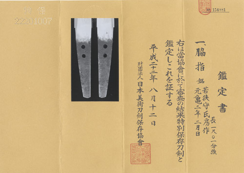 | A5820(W8570) 脇指 銘 若狭守氏房作 元亀二年二月日 | 特別保存刀剣 |