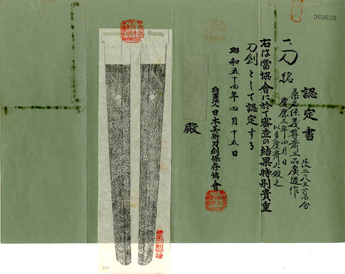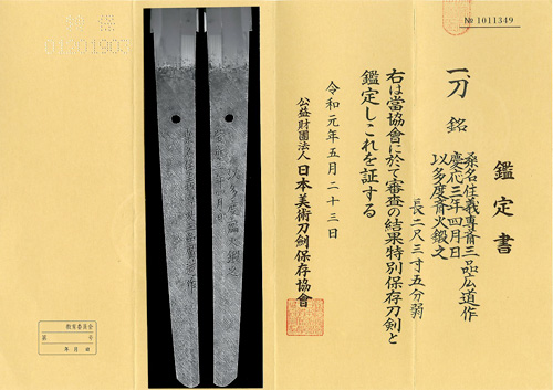 | 剣形:鎬造り、庵棟低い。寸が延びて身幅広く、重ね厚くついて浅めの反りが付き中峰延びる勇壮な体躯。鎬地に比して平地広い造り込み。はばきを含む刀身重量861㌘(刀身拡大写真) 鍛肌:小板目肌よく詰んで精良な地沸つき、精緻な地景がつく美しい地鉄。 刃紋:広直刃で焼きだして小沸出来の大房丁子・足長丁子に互の目を交えて焼刃高い。丁子の足が刃先に向かって長く放射し、刃中は清涼な匂で満ちて明るい。 帽子:横手下で互の目を焼いて、表は直ぐに中丸、裏は湾れて中丸に返る。 中心:生ぶ。長めの茎は刃側を舟底風におろして刃上がり栗尻。鑢目は大筋違に化粧鑢、棟小肉つきここにも大筋違の鑢目がある。茎孔壱個。佩表の上方棟に小振りの長銘『桑名住義専齋三品廣道作』、裏の鎬地には『慶應三年四月日』の年紀があり、平地には『以多度齋火鍛之』の切付が刻されている。 義専齋廣道は伊勢桑名の産、『三品藤右衛門廣道』の次男で、『三品藤九郎廣道』という。長兄の『三品半兵衛廣房』とともに固山宗平、宗次に師事して備前伝の鍛法を取得。兄『廣房』と共に鍛冶町(三重県桑名市鍜冶町54)に鞴を構えた。 多度大社には製鉄・鍛冶の御祭神とされる『 附)黒磯草塗鞘打刀拵(拵全体写真・刀装具拡大写真)