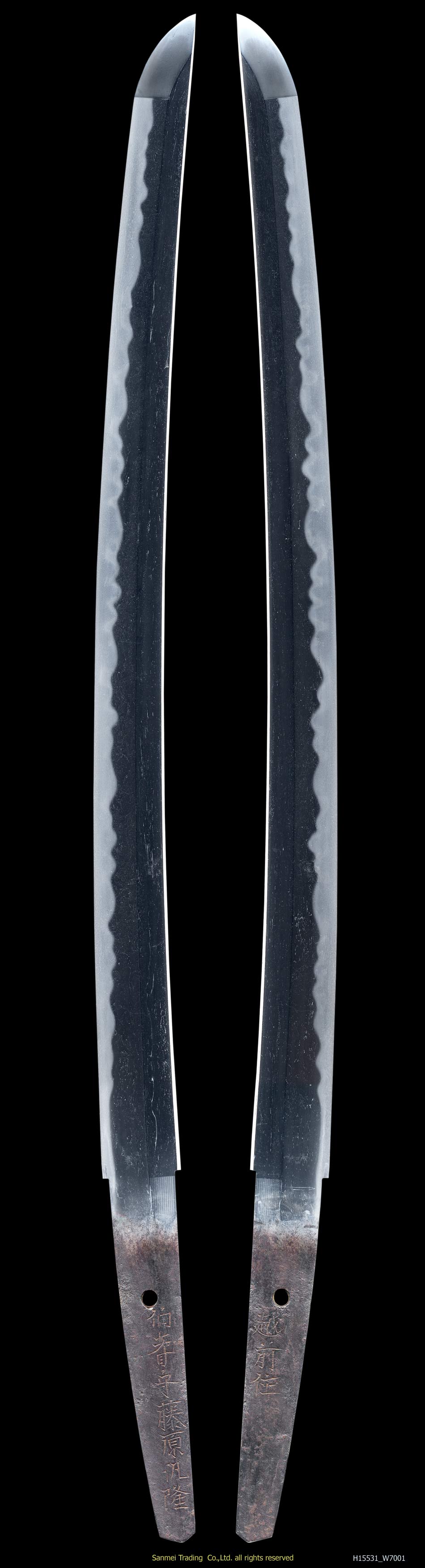 | 新刀 江戸時代前期(承応/1652年頃) 越前 刃長46.0cm 反り0.9cm 元幅31.6mm 元重6.5mm 先幅22.5mm |